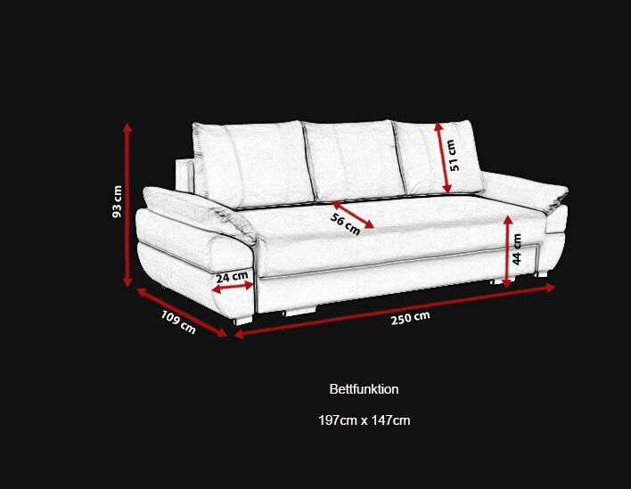 Erhalten Sie den perfekten Schlaf- und Sitzplatz mit unserem 3-Sitzer Schlafsofa mit Klappcouch und Schlaffunktion inklusive Bettkasten. Dieses weiche Dreisitzer-Sofa ist in verschiedenen Größen und Farben erhältlich, darunter Taubengrau, Zementgrau, Lavendelgrau und viele mehr. Wählen Sie aus Stoff oder Premium Kunstleder in verschiedenen Gruppen und entdecken Sie die vielseitigen Möglichkeiten. Die Maße betragen ca. 250 cm in der Länge, 93 cm in der Höhe und 109 cm in der Tiefe. Die Liegefläche der Bettfunktion beträgt ca. 197 x 147 cm und der Bettkasten ist im Preis inbegriffen. Das Innengestell aus echtem Holz sorgt für Stabilität und der Federkern für hohen Komfort. Entspannen Sie in vielseitigem Design und genießen Sie Funktionalität und Stil in einem Möbelstück. Wählen Sie Ihre Wunschfarbe und Materialart, um ein Sofa zu erhalten, das perfekt zu Ihrem Einrichtungsstil passt. Nutzen Sie die praktische Schlaffunktion und den Bettkasten für zusätzlichen Stauraum. Bestellen Sie noch heute Ihr neues Lieblingssofa!
