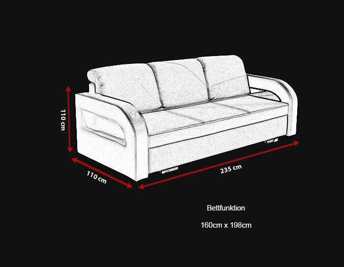 Schlafsofa Klappcouch 3-Sitzer Schlaffunktion + Bettkasten Couch Design Sofa