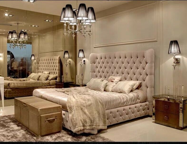 Bringen Sie mit dem echten Chesterfield Bett Doppel Hotel Betten Textil Polster in Ihr Schlafzimmer Luxus und Eleganz! Hergestellt mit höchster Präzision und Sorgfalt, bietet dieses Bett eine Liegefläche von 160 x 200 cm (Außenmaße 190 x 240 cm) und eine Höhe von ca. 140 cm. Wählen Sie aus einer Vielzahl von Farben und Materialien, darunter Premium Kunstleder/Stoff, Premium Echtleder oder Premium Samt Stoff. Das Bett verfügt über ein Innengestell aus echtem Holz und Unterfederung mit Federkern für maximalen Komfort. Optional können Sie auch Kristallsteine oder sogar echte Swarovski Kristallsteine für eine luxuriöse Note hinzufügen. Genießen Sie die exquisite Handwerkskunst und die Qualität des italienischen Rindsleders, das diesem Bett eine einzigartige Ästhetik verleiht. Holen Sie sich noch heute das ultimative Bett für Ihr Schlafzimmer und tauchen Sie ein in luxuriösen Schlafkomfort!