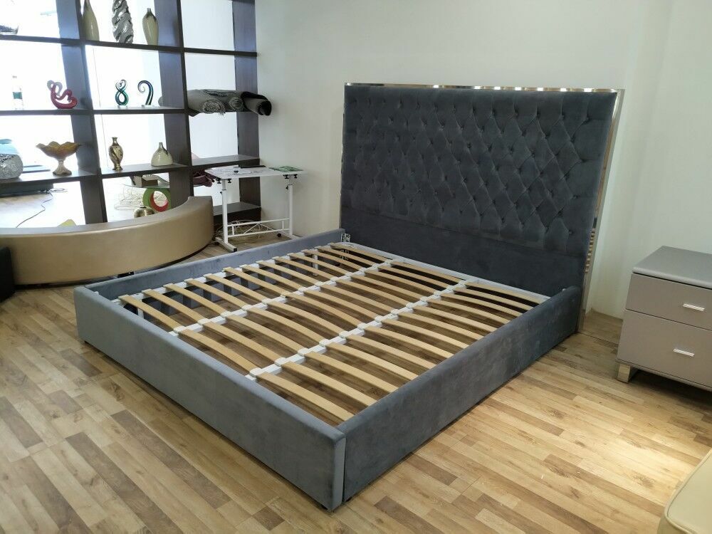Großes stilvolles Chesterfield graues Doppelbett Textil Betten Luxus Design
