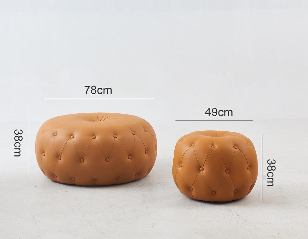 Erhöhen Sie den Komfort und den Stil Ihres Wohnzimmers mit unserem Fußhocker Runder Hocker Chesterfield! Dieser runde Hocker in lebendigem Orange aus Premium Lederfaserstoff wird Ihre Gäste begeistern. Mit Maßen von ca. Ø 78 x 35 cm und einem soliden Holzgestell bietet er Ihnen nicht nur eine bequeme Sitzgelegenheit, sondern auch genügend Platz, um Ihre Beine abzulegen. Sie haben die Möglichkeit, die Farbe des Hockers frei zu wählen und können zwischen verschiedenen Materialoptionen wie Premium Echtleder, Textilstoff oder Vollleder wählen. Unser italienisches Rindsleder sorgt für Widerstandsfähigkeit und Langlebigkeit. Passen Sie Ihr Möbelstück nach Ihren Wünschen an! Verleihen Sie Ihrem Zuhause mit unserem individuell anpassbaren Hocker das gewisse Etwas. Machen Sie noch heute Ihre Wohnträume wahr!