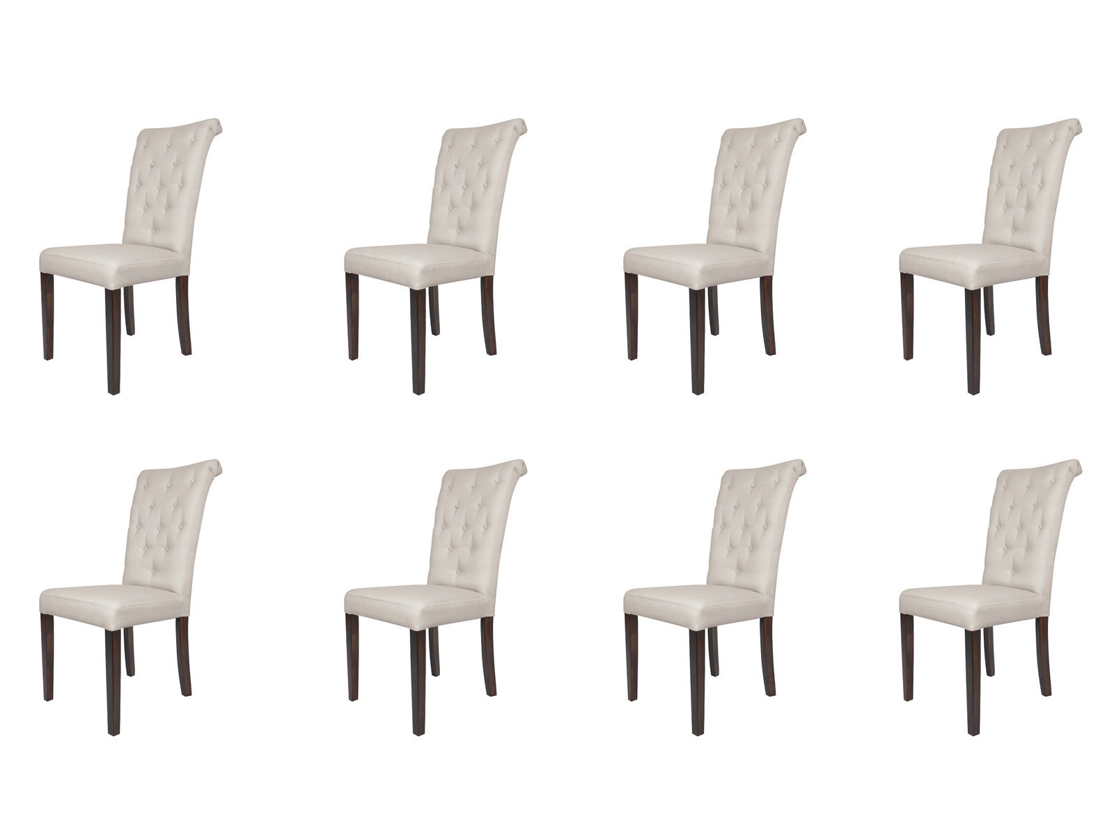 Erneuern Sie Ihr Ess- oder Wohnzimmer mit unserem exklusiven 8-teiligen Stuhl-Set im modernen Lehn-Design! Jeder Stuhl ist sorgfältig gefertigt und bietet höchsten Komfort und Stil. Die Maße jedes Stuhls betragen ca. 99 cm in der Gesamthöhe und ca. 46 cm bis zum Sitzplatz. Der Sitz ist ungefähr 46 bis 37 cm breit und 43 cm tief. Sie haben die Freiheit, die Farbe und das Material selbst auszuwählen - ob Samt, Velours, Polyester, Kunstleder oder echtes Leder. Wählen Sie zusätzlich zwischen Knöpfen oder funkelnden Kristallsteinen, gegen Aufpreis verfügbar. Der Korpus jedes Stuhls ist aus echtem Holz gefertigt, was für Robustheit und Langlebigkeit sorgt. Bringen Sie mit diesem Stuhl-Set Eleganz und Gemütlichkeit in Ihr Zuhause und genießen Sie zugleich die Freiheit der individuellen Anpassung. Bestellen Sie noch heute und lassen Sie sich von der Qualität unserer Produkte überzeugen!