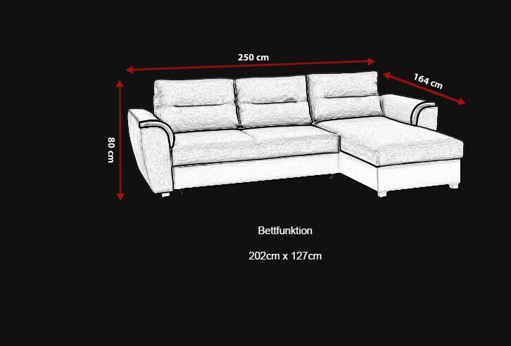 Bringen Sie den Komfort und die Eleganz mit diesem brandneuen Designer-Schlafsofa in Ihr Zuhause! Dieses Ecksofa mit Bettfunktion und Bettkasten in L-Form ist nicht nur äußerst bequem, sondern auch äußerst praktisch. Mit einer Liegefläche von ca. 202 x 127 cm bietet es ausreichend Platz zum Entspannen und Übernachten. Außerdem verfügt es über einen Bettkasten, in dem Sie problemlos Bettwäsche oder Kissen verstauen können. Sie haben die Wahl aus einer Vielzahl von Farben, darunter von Zyan bis Schwarz, Elfenbein und mehr! Zudem können Sie das Material entsprechend Ihren Wünschen auswählen, entweder aus Stoff oder Premium Kunstleder in verschiedenen Gruppen. Das Ecksofa verfügt über ein Innengestell aus echtem Holz und eine komfortable Federkernpolsterung. Für zusätzlichen Luxus können Sie gegen einen Aufpreis von 99,00 CHF die Unterboden LED-Beleuchtung hinzufügen. Mit Maßen von ca. 250 x 164 cm und einer Höhe von ca. 80 cm passt dieses stilvolle Sofa perfekt in Ihr Wohnzimmer und lässt es in neuem Glanz erstrahlen. Holen Sie sich noch heute dieses exklusive Schlafsofa und verleihen Sie Ihrem Zuhause einen Hauch von Luxus und Komfort!