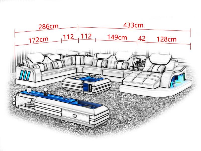 Entdecken Sie das Ecksofa in U-Form mit dem exklusiven Couchtisch von XL Möbel! Mit unserer Polstergarnitur holen Sie sich ein wahres Designhighlight in Ihr Zuhause. Das Ecksofa ist in zwei verschiedenen Größen erhältlich und bietet mit seinen Maßen von ca. 286 x 433 x 195 cm oder ca. 195 x 433 x 286 cm genügend Platz zum Entspannen. Die Premium-Lederfaserstoff-Mischung (70% Leder / 30% Polyester) sorgt für ein luxuriöses Sitzgefühl. Der moderne Couchtisch mit den Maßen 120 x 70 x 42 cm verfügt sogar über 3 USB-Anschlüsse, für noch mehr Komfort in Ihrem Wohnzimmer. Wählen Sie aus einer Vielzahl von Farben Ihre Lieblingsfarbe aus und gestalten Sie Ihr Ecksofa ganz nach Ihren Wünschen. Optional können Sie zwischen verschiedenen Materialien wie Echtleder, Textilstoff oder Vollleder wählen. Das Highlight: Individualisieren Sie Ihr Sofa mit Zusatzfunktionen wie einer elektrischen Relax-Fußstütze, einem Soundsystem über Bluetooth oder einer Unterbodenbeleuchtung mit Fernbedienung - für eine gemütliche Atmosphäre in Ihrem Wohnbereich. Das Ecksofa besticht zudem durch hochwertiges Italienisches Rindsleder, echtes Holz im Innengestell und überzeugt mit einer erstklassigen Verarbeitung. Bringen Sie Stil und Komfort in Ihr Zuhause mit der Wohnlandschaft von XL Möbel - Jetzt bestellen und das Wohnzimmer in eine moderne Wohlfühloase verwandeln!