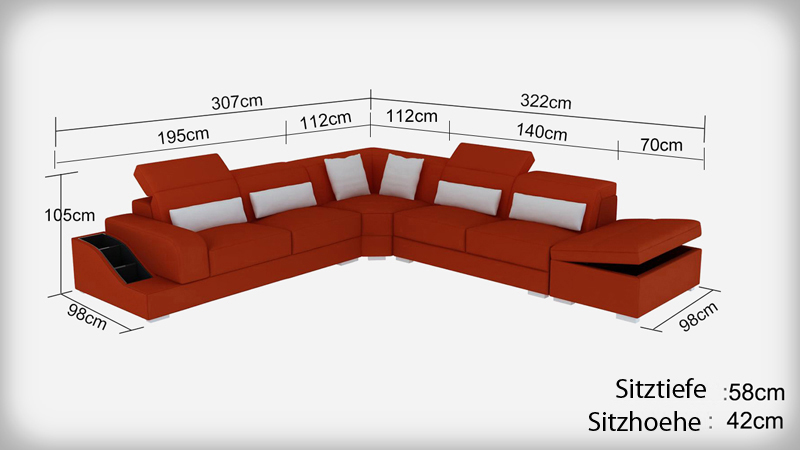 Entdecken Sie die perfekte Ergänzung für Ihr Wohnzimmer mit unserer modernen Ledersofa Couch Wohnlandschaft in L-Form! Mit den Maßen ca. 307 x 322 cm oder 322 x 307 cm bietet dieses Ecksofa Eck Garnitur viel Platz zum Entspannen. Die Höhe beträgt ca. 105 cm und die Tiefe ca. 98 cm. Genießen Sie den hervorragenden Sitzkomfort mit einer Sitzhöhe von ca. 42 cm und einer Sitztiefe von ca. 58 cm. Wählen Sie aus einer Vielzahl von Farben wie Zyan, Burgunderrot, Schokolade und vielen mehr - oder lassen Sie sich Ihr Wunschsofa in einer anderen Farbe anfertigen. Das Material besteht aus Premium Lederfaserstoff (70% Leder / 30% Polyester) für ein luxuriöses Gefühl. Zusätzlich können Sie die Couch mit einer Bettfunktion ausstatten, um Gästen eine bequeme Übernachtungsmöglichkeit zu bieten. Entscheiden Sie sich für Premium Echtleder oder Premium Textilstoff gegen Aufpreis, je nach Ihren individuellen Vorlieben. Das Ecksofa verfügt über ein stabiles Innengestell aus echtem Holz und besticht durch sein modernes Design. Gönnen Sie sich und Ihrer Familie dieses exquisite Wohnmöbel und genießen Sie entspannte Stunden auf Ihrer neuen Wohnlandschaft!