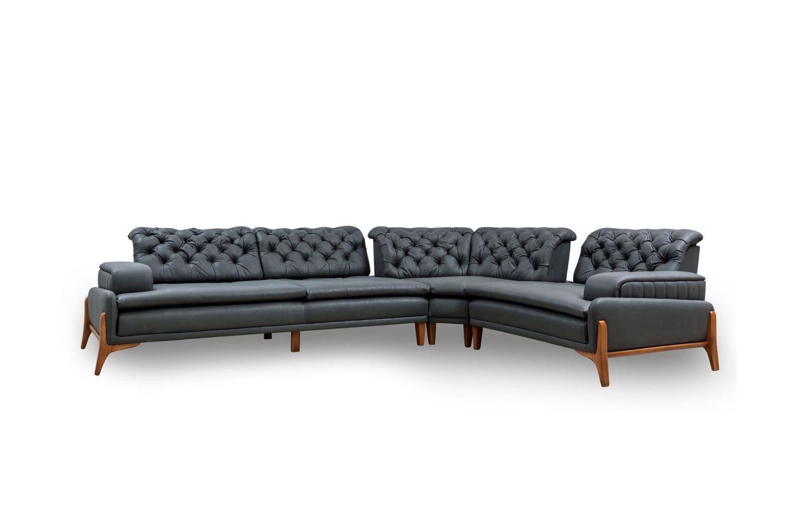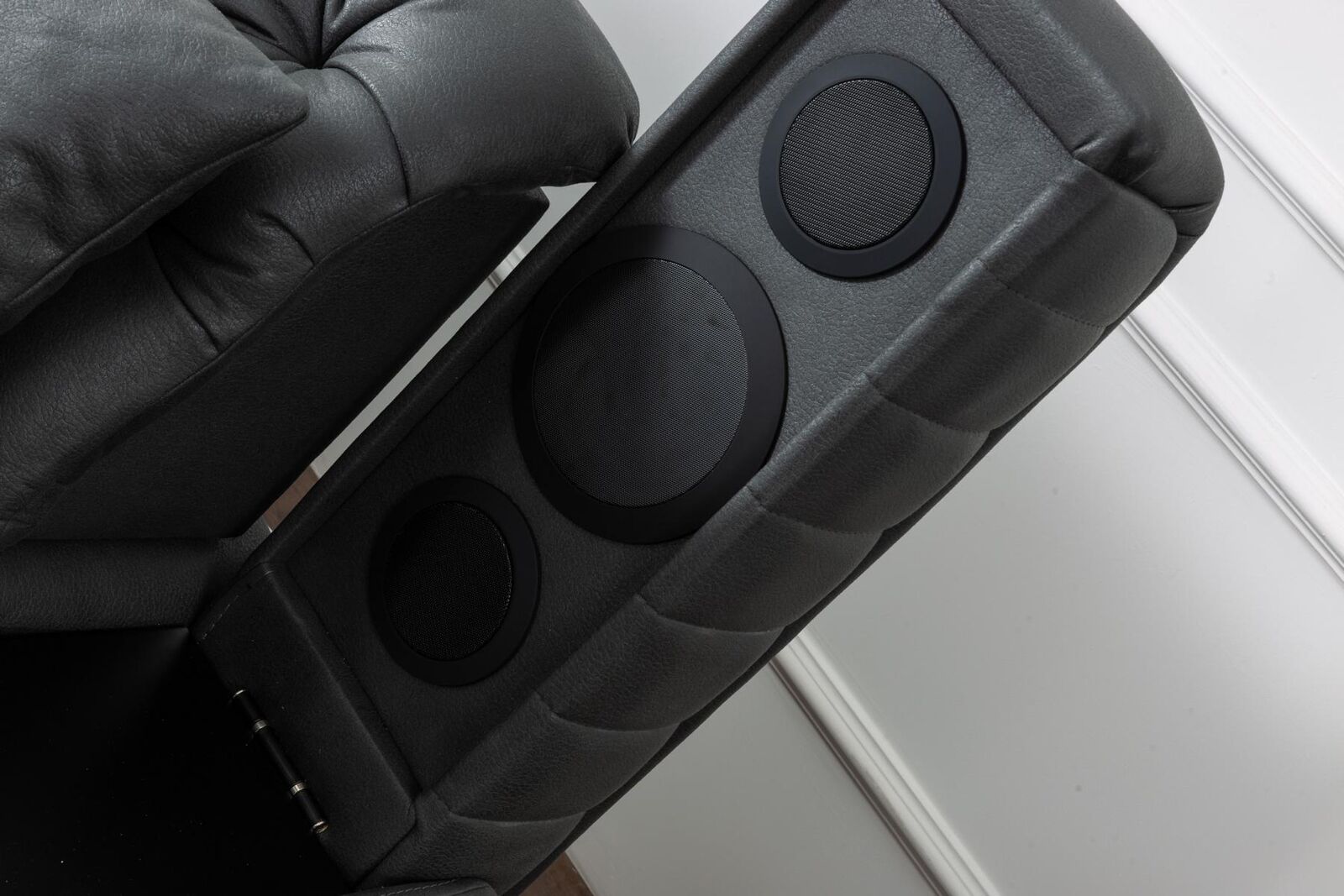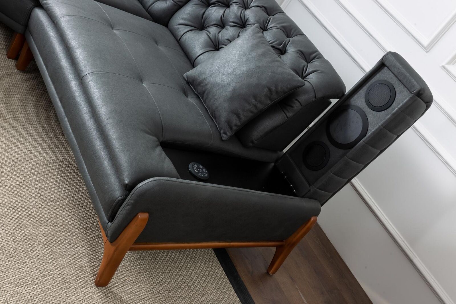 Luxus-Ecksofa, L-förmiges Ecksofa, graue Polstermöbel, moderne Möbel, Musiksystem