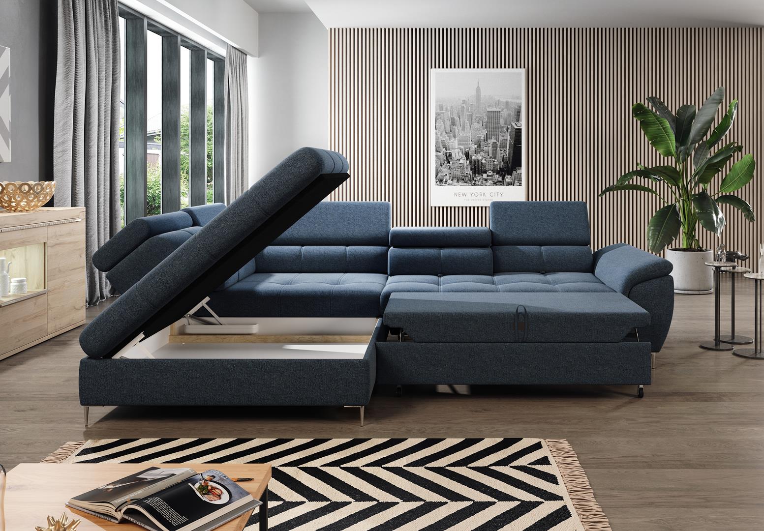 Willkommen bei XL Möbel! Unser Schlafsofa Design Ecksofa in L-Form mit Bettfunktion und Textilbezug wird zum Highlight in Ihrem Zuhause. Mit Maßen von ca. 290 x 215 x 77/94 cm bietet es genügend Platz zum Entspannen. Wählen Sie aus einer Vielzahl von Farben wie Moosgrün, Königsblau oder Türkisblau, um das Sofa an Ihren Stil anzupassen. Sie haben auch die Möglichkeit, das Material auszuwählen, sei es Stoff (Gruppe 1), Premium Kunstleder (Gruppe III) oder eine Kombination aus beidem (Gruppe IV). Das Schlafsofa verfügt über einen Bettkasten und kann optional mit Unterboden LED Beleuchtung ausgestattet werden. Das Innengestell aus echtem Holz sorgt für Stabilität und der Federkern für Komfort. Lassen Sie sich von unserem individuellen Service überzeugen und kontaktieren Sie uns für kundenspezifische Anpassungen. Machen Sie Ihr Zuhause mit unserem modernen Schlafsofa zu einem gemütlichen Ort!