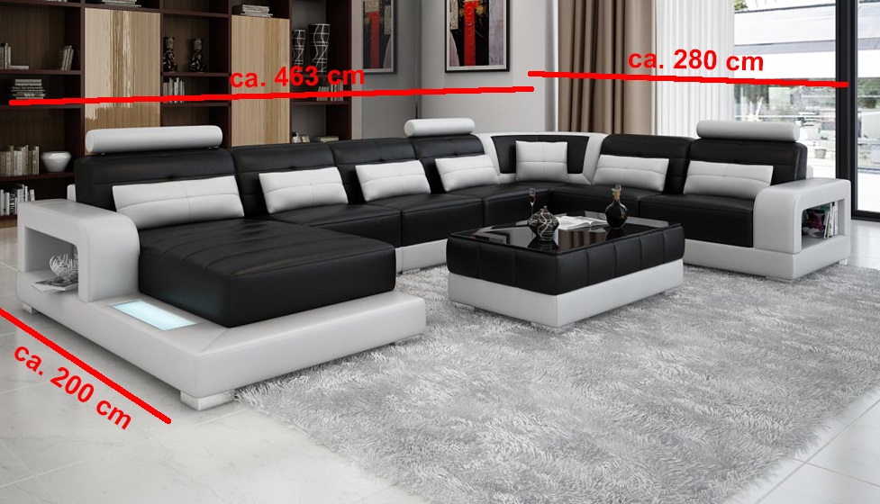 Genießen Sie maximalen Komfort und zeitlosen Stil mit unserem Modernen XXL U-Form Sofa für das Wohnzimmer! Mit Maßen von ca. 200 x 463 x 280 cm oder 280 x 463 x 200 cm bietet dieses Sofa viel Platz zum Entspannen. Optional mit Bettfunktion gegen einen kleinen Aufpreis erhältlich, können Sie es zu einem multifunktionalen Möbelstück erweitern. Wählen Sie aus einer Vielzahl von Farben frei aus, darunter Zyan, Flieder, Weinrot, und viele mehr. Das Premium Kunstleder sorgt für eine luxuriöse Optik und ist einfach zu reinigen. Sie haben auch die Möglichkeit, zwischen verschiedenen Materialien zu wählen, darunter Premium Textilstoff und sogar echtes italienisches Rindsleder. Mit einem Innengestell aus echtem Holz und Federkern bietet dieses Sofa nicht nur Stil, sondern auch eine langlebige Qualität. Verleihen Sie Ihrem Wohnzimmer mit diesem Modernen XXL U-Form Sofa eine elegante Note!