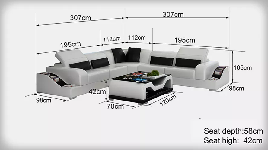 Entdecken Sie das neue Ledersofa Couchen Design für Ihr Wohnzimmer! Mit diesem günstigen und hochwertigen Polstermöbel verleihen Sie Ihrem Zuhause eine stilvolle Note. Die Sitzgarnitur besteht aus einer bequemen Eckcouch in L-Form mit den Maßen ca. 307 x 307 cm. Die Möbel sind ca. 105 cm hoch, mit einer angenehmen Sitzhöhe von ca. 42 cm und einer Tiefe von ca. 98 cm. Der Couchtisch misst ca. 80 x 80 x 42 cm und vervollständigt das moderne Design. Sie haben die freie Farbwahl und können Ihr Ledersofa in zahlreichen Farben wie Zyan, Weinrot, Schwarz oder Elfenbein wählen. Das Material besteht aus hochwertigem Premium Lederfaserstoff (70% Leder / 30% Polyester), optional ist auch Echtleder oder Textilstoff erhältlich. Das Innengestell ist aus echtem Holz gefertigt für Stabilität und Langlebigkeit. Erwerben Sie jetzt Ihr neues Lieblingsmöbelstück und genießen Sie entspannte Stunden auf dieser gemütlichen Sitzgarnitur!