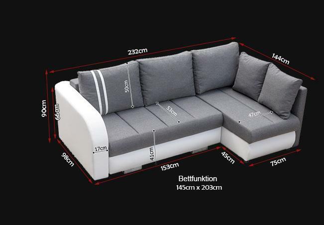 Erwerben Sie jetzt das moderne „Sofa Schlafsofa Designer“ mit Bettfunktion und Bettkasten von XL Möbel! Dieses stilvolle Ecksofa in L-Form bietet nicht nur Komfort und Design, sondern auch praktische Funktionen für Ihr Zuhause. Mit Maßen von ca. 232 x 144 cm und einer Höhe von ca. 90 cm passt dieses Sofa ideal in Ihr Wohnzimmer. Wählen Sie aus einer Vielzahl von Farben wie Zyan, Amethyst, Flieder und vielen mehr, die unter dem Reiter "Farben" aufgeführt sind. Entscheiden Sie sich außerdem zwischen Stoff oder Premium Kunstleder in verschiedenen Preiskategorien. Die integrierte Bettfunktion mit einer Liegefläche von ca. 145 x 203 cm sorgt für gemütliche Übernachtungsmöglichkeiten. Der Bettkasten bietet zusätzlichen Stauraum für Ihre Utensilien. Gegen einen Aufpreis von + 99,00CHF erhalten Sie sogar eine Unterboden LED Beleuchtung. Das Ecksofa ist mit einem Innengestell aus echtem Holz und Federkern gefertigt, was für Langlebigkeit und Komfort sorgt. Bestellen Sie jetzt das „Sofa Schlafsofa Designer“ und verwandeln Sie Ihr Wohnzimmer in eine stilvolle und gemütliche Oase!