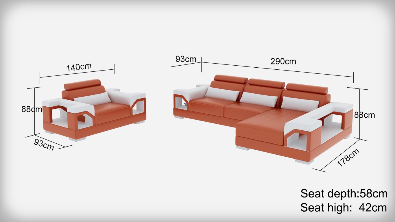 Erleben Sie Luxus und Komfort mit unserer modernen Wohnlandschaft! Dieses Ecksofa in L-Form ist die perfekte Ergänzung für Ihr Zuhause. Hergestellt aus hochwertigem Premium Lederfaserstoff bietet es nicht nur ein stilvolles Design, sondern auch eine gemütliche Sitzgelegenheit. Mit den Maßen von ca. 290 x 178 cm (oder ca. 178 x 290 cm) und einer angenehmen Sitzhöhe von ca. 42 cm passt dieses Sofa ideal in Ihr Wohnzimmer. Das Set beinhaltet auch einen passenden Sessel, der mit den Maßen 140 x 93 x 88 cm ebenfalls Platz zum Entspannen bietet. Als besonderes Highlight sind 3 USB Anschlüsse inklusive, um Ihre elektronischen Geräte bequem zu laden. Wählen Sie Ihre Lieblingsfarbe aus unserer breiten Auswahl, darunter Zyan, Burgunderrot, Schwarz und viele mehr. Entscheiden Sie sich außerdem für verschiedene Materialoptionen wie Premium Echtleder, Textilstoff oder Vollleder, je nach Ihren persönlichen Vorlieben. Für zusätzlichen Komfort können Sie Ihr Sofa mit einer elektrischen Relax-Fußstütze, einem Soundsystem über Bluetooth oder einer Unterbodenbeleuchtung mit Farbwechsel ausstatten. Aufpreise für diese Extras sind verfügbar. Holen Sie sich jetzt dieses moderne Sofa Leder Couch Set und verwandeln Sie Ihr Wohnzimmer in eine stilvolle Wohlfühloase!