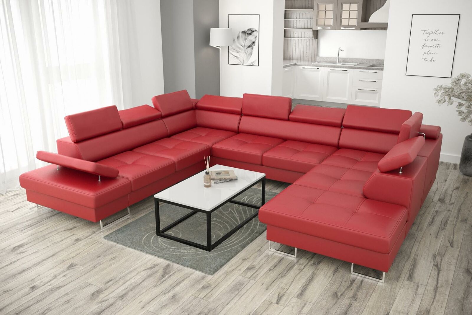 Erwerben Sie jetzt Ihre Traum-Wohnlandschaft in U-Form aus Textil oder Leder bei XL Möbel! Unsere Ecksofas sind weich gepolstert und bieten höchsten Komfort. Wählen Sie aus einer Vielzahl von Farben wie Rubinrot, Schokolade, Schwarz und vielen mehr. Die Maße betragen ca. 350 x 280/220 x 98 cm und bieten viel Platz für gemütliche Abende. Das Innengestell aus echtem Holz sorgt für Stabilität und Langlebigkeit. Entscheiden Sie sich zwischen verschiedenen Materialoptionen wie Stoffgruppe 1, Premium Kunstleder Gruppe III oder IV. Optional können Sie einen Bettkasten und Unterboden LED-Beleuchtung dazu bestellen. Machen Sie Ihr Wohnzimmer zum perfekten Ort zum Entspannen mit unserer modernen U-Form Wohnlandschaft! Profitieren Sie von unserer großen Farbauswahl und bestellen Sie jetzt!