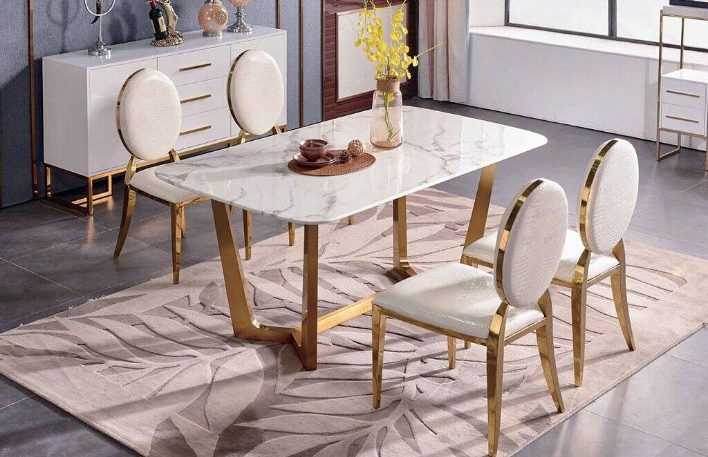 Entdecken Sie unsere moderne Esszimmereinrichtung: Das 5-teilige Set, bestehend aus einem Esstisch und 4 Stühlen, ist die perfekte Ergänzung für Ihr Zuhause. Der Esstisch hat die Maße 140 * 80 * 75 cm und ist in anderen Größen wie 160*90*75cm und 180*90*75cm erhältlich. Die vier Stühle sind 38 * 44 * 120 cm groß und bieten hohen Sitzkomfort. Der Esstisch besticht durch sein zeitloses Design mit Beinen aus Edelstahl und einer Arbeitsplatte aus Stein. Die Farbe entspricht der Abbildung, aber andere Farben sind auf Anfrage möglich. Holen Sie sich jetzt diese stilvolle Esszimmergarnitur von XL Moebel und machen Sie Ihr Esszimmer zu einem modernen Blickfang!