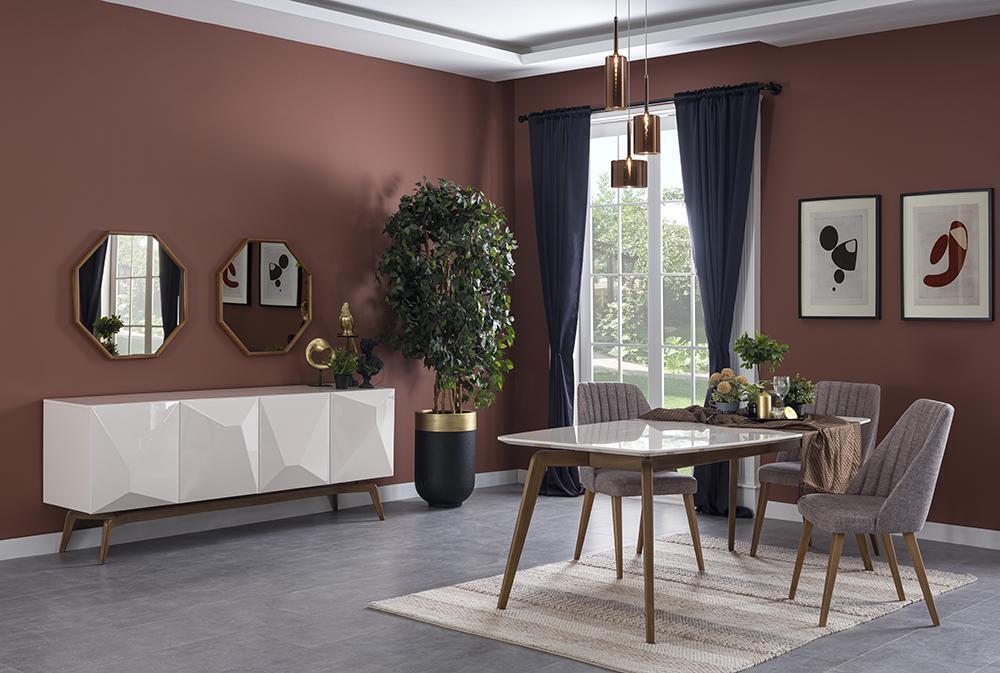 Entdecken Sie das Esszimmer Komplett Moderne Design Set von XL Moebel! Mit diesem Set erhalten Sie einen stilvollen Esstisch, 4 moderne Stühle und ein Sideboard mit zwei Spiegeln. Der Esstisch hat die Maße ca. 190 x 90 x 78 cm und wird von den 4 Stühlen begleitet, die jeweils ca. 50 x 50 x 90 cm messen. Das Sideboard mit den Spiegeln misst ca. 208 x 47 x 80 cm. Alle Teile sind aus hochwertigem Holz gefertigt und die Farbe entspricht dem abgebildeten Produkt. Erweitern Sie Ihr Esszimmer um dieses moderne Set und gestalten Sie Ihren Essbereich neu!