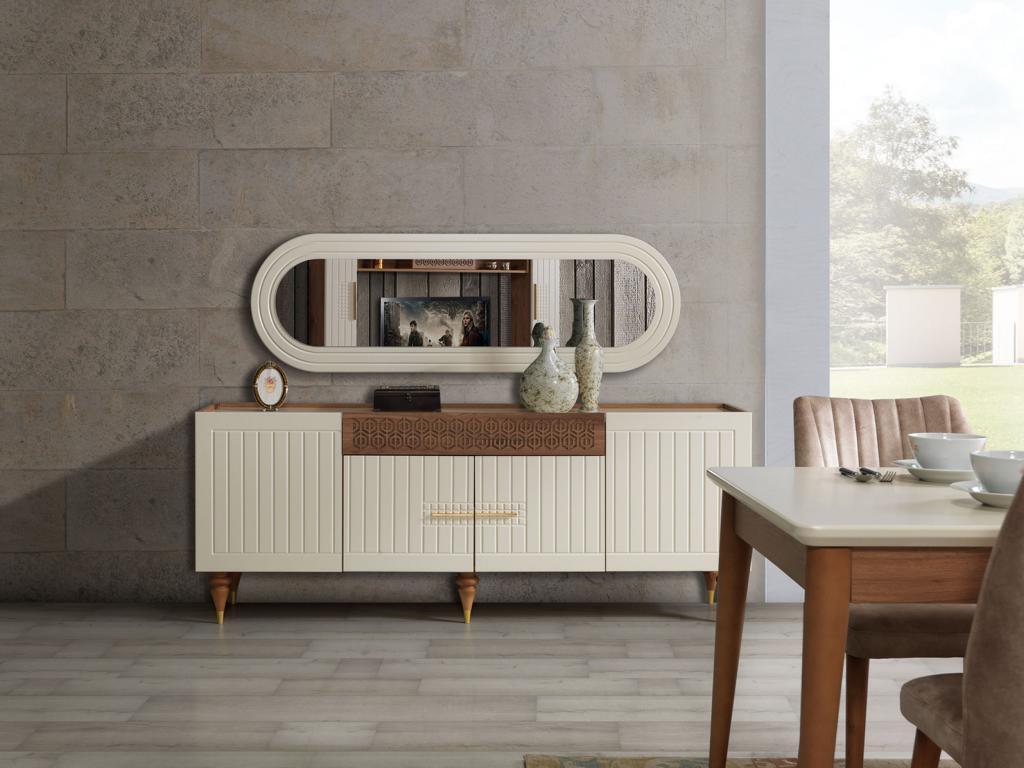 Verleihen Sie Ihrem Esszimmer mit diesem 11-teiligen Esszimmerset in Braun einen Hauch von Eleganz und Stil. Das Set besteht aus einem erweiterbaren Tisch, vier Stühlen, einer Anrichte, einem Spiegel, einem TV-Ständer, einem Seitenschrank und einem Wandregal - alles in perfekter Harmonie. Der Tisch misst ca. 160 x 90 x 80 cm und kann von 162 cm auf 202 cm verlängert werden. Die vier Stühle haben die Maße von ca. 64 x 60 x 95 cm und bieten hohen Sitzkomfort. Alle Möbelstücke bestehen aus hochwertigem Holz, Textil und Glas. Lassen Sie sich von der Qualität und dem Design dieses Sets überzeugen und holen Sie sich ein Stück Gemütlichkeit in Ihr Zuhause!