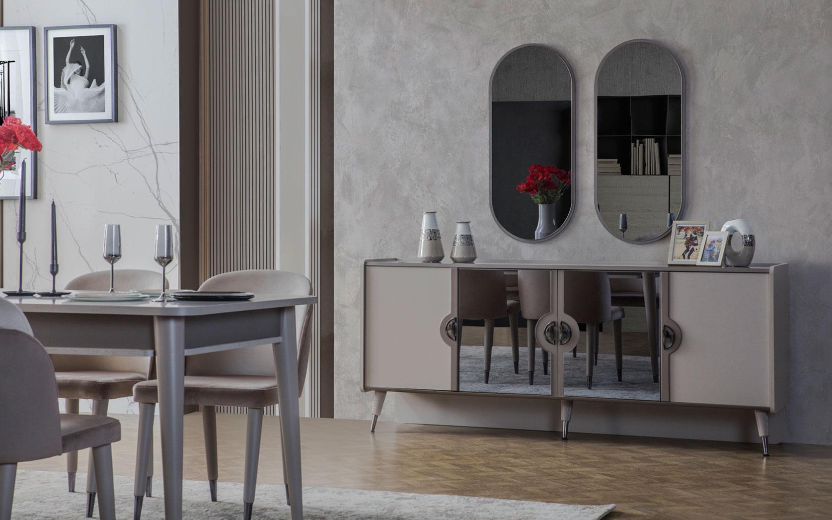 Verschönern Sie Ihr Esszimmer mit der eleganten grauen Esszimmergarnitur von XL Moebel! Diese beinhaltet einen ausziehbaren Esstisch, sechs Stühle, ein Sideboard sowie zwei Spiegel - alles in ansprechendem Design und hochwertigen Materialien gefertigt. Die Maße sorgen für genügend Platz zum Essen und Verweilen. Holen Sie sich mit diesem Set ein stilvolles Ambiente nach Hause!