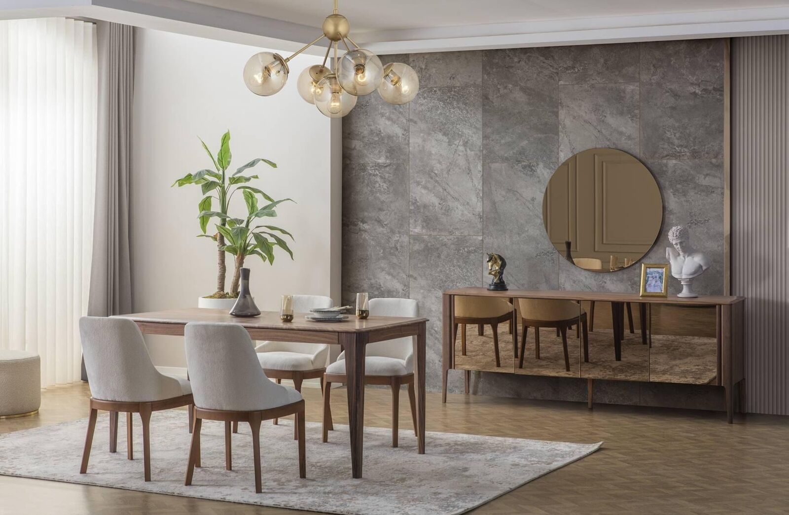 Erweitern Sie Ihr Esszimmer mit dieser luxuriösen Esszimmer Garnitur, bestehend aus einem rechteckigen Esstisch, 6 Textilstühlen, einer Anrichte und einem passenden Spiegel. Der Esstisch misst ca. 209 x 115 x 78 cm und kann auf ca. 247 x 115 x 78 cm ausgezogen werden. Die Stühle haben die Maße ca. 55 x 59 x 83 cm und die Anrichte ca. 214 x 48 x 82 cm. Der Spiegel ergänzt das Set perfekt mit ca. 92 x 2 x 92 cm. In elegantem Holz, Textil und Glas gehalten, fügt sich dieses Set perfekt in Ihren Raum ein. Holen Sie sich jetzt diese Esszimmergarnitur in Ihrer Wunschfarbe (andere Farben auf Anfrage) und genießen Sie luxuriöse Mahlzeiten in stilvollem Ambiente.