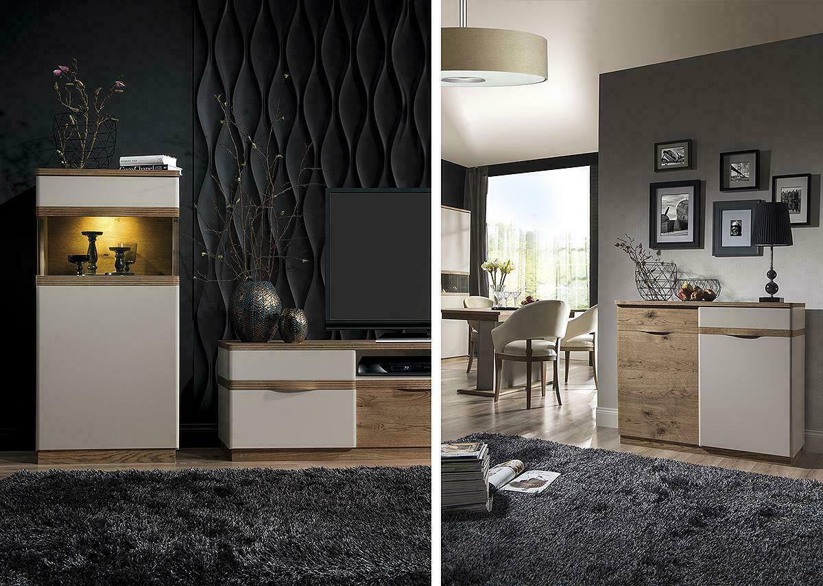 Rückwand & Einlegeböden: MDF (Mitteldichte Holzfaserplatte), furniert & lackiert