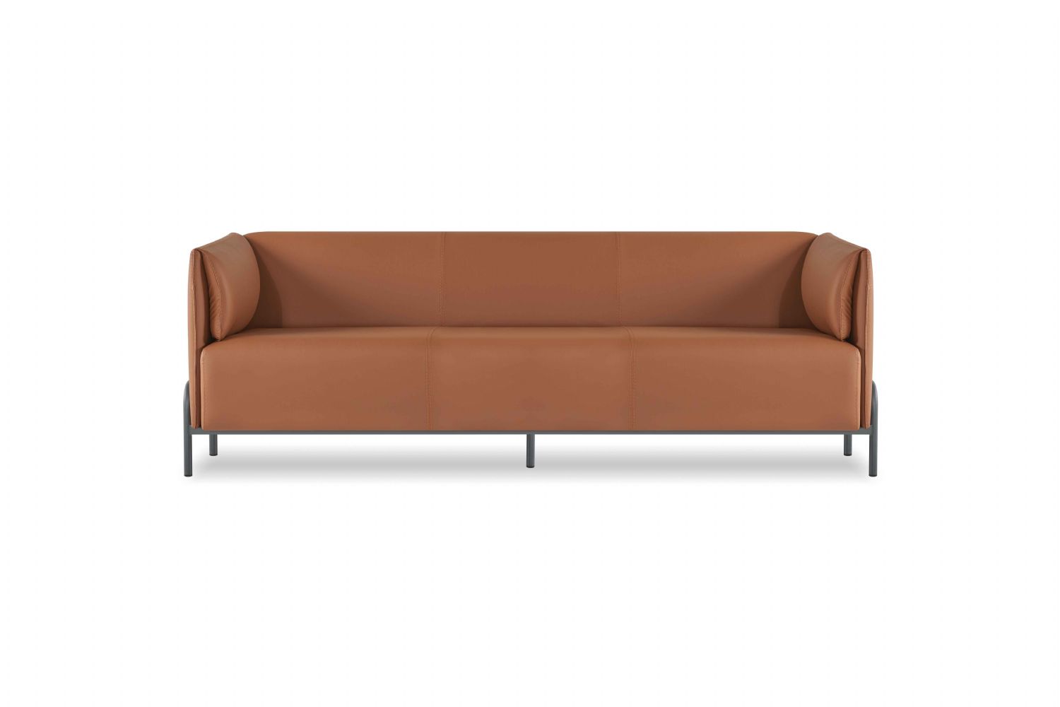 Dieses Büromöbel-Set besteht aus einem dreisitzigen Sofa, zwei Korbsesseln mit