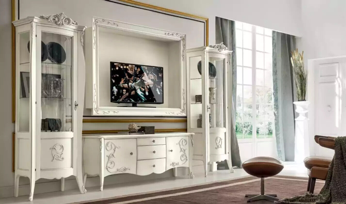 Entdecken Sie die zeitlose Eleganz der klassischen weißen Wohnwand von Giuliacasa! Hergestellt in Italien aus hochwertigem Holz, besticht dieses Set durch sein stilvolles Design und seine erstklassige Verarbeitung. Die Wohnwand umfasst ein Lowboard, zwei Vitrinen und einen TV-Rahmen - perfekt für Ihr Wohnzimmer. Die Maße reichen von ca. 166 x 44 x 68 cm bis ca. 78 x 49 x 212 cm. Lassen Sie sich von italienischem Charme und Luxus verzaubern! Holen Sie sich ein Stück italienische Lebensart nach Hause - made in Italy steht für Qualität, Eleganz und zeitlose Schönheit. Gönnen Sie sich dieses exklusive Möbelstück und bringen Sie Stil in Ihr Zuhause!