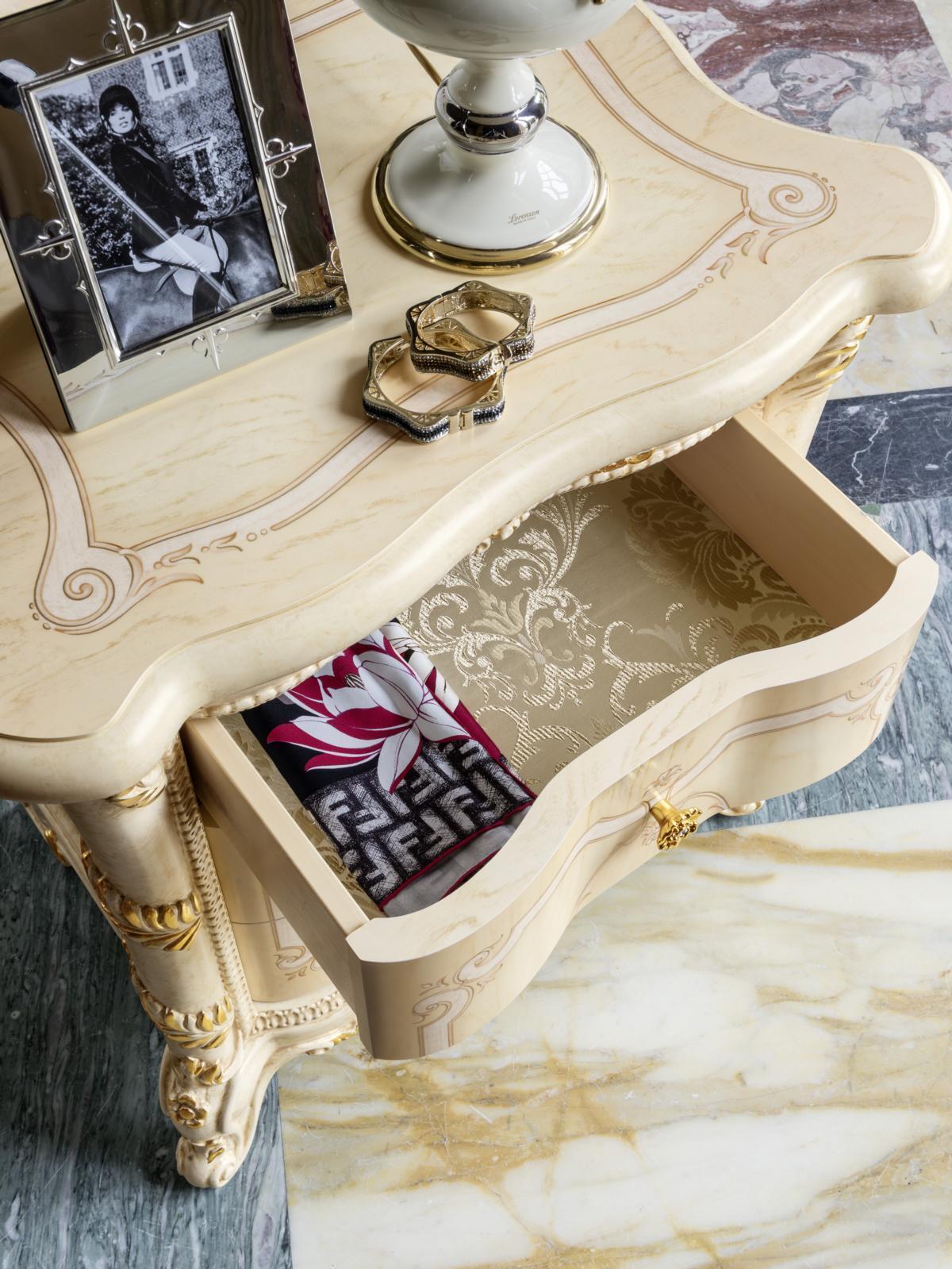 Entdecken Sie das wunderschöne 2-teilige Set italienischer Möbel von XL Möbel! Diese Massivholz-Kommode mit Spiegel und Sideboard verleiht Ihrem Zuhause eine elegante und klassische Note. Hergestellt aus hochwertigem Holz und in der Farbe wie abgebildet, ist dieses Set ein zeitloses Schmuckstück für Ihr Zuhause. Die Kommode misst ca. 147 x 67,5 x 120 cm und der Spiegel ca. 129 x 14 x 110 cm. Erwerben Sie exklusive Schlafzimmermöbel im klassischen Stil von XL Möbel und tauchen Sie ein in die Welt des Barock, Rokoko, Louis XV, Empire und mehr. Lassen Sie sich von den edlen Hölzern, geschwungenen Formen, Chinoiserie-Dekorationen und filigranen Schnitzereien begeistern. Verleihen Sie Ihrem Zuhause mit diesem einzigartigen Set italienischer Möbel einen Hauch von Luxus und Eleganz!