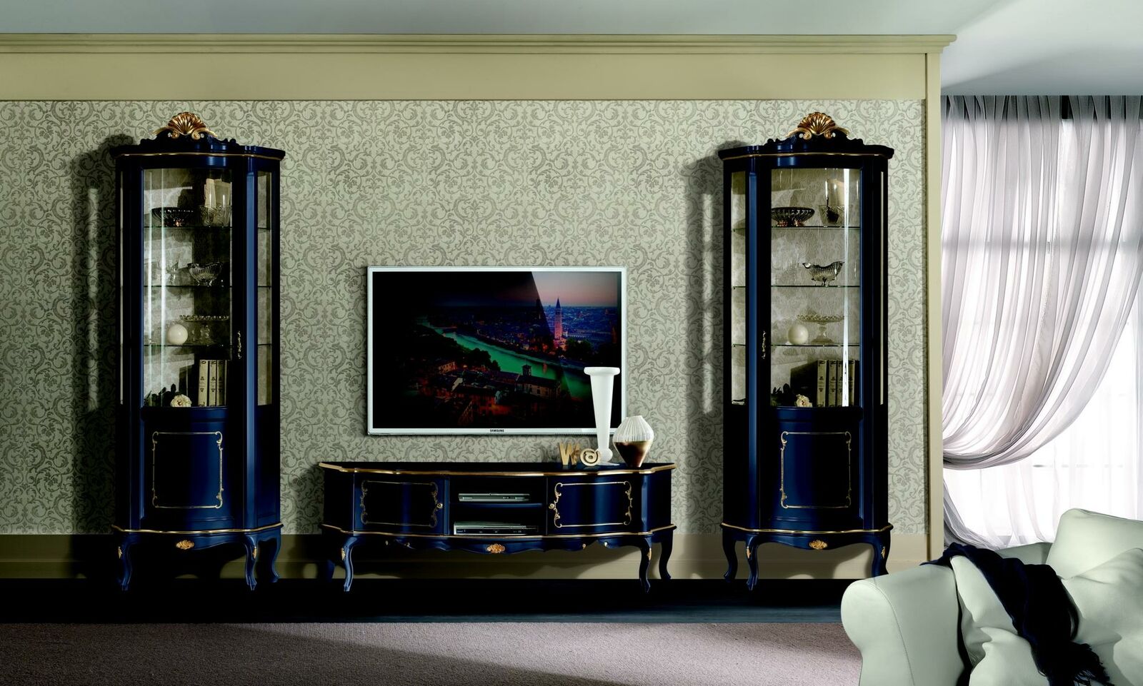 Luxus Set Garnitur 3tlg rtv mit 2x Vitrine Blau Italienische Luxus Möbel Barock Stil