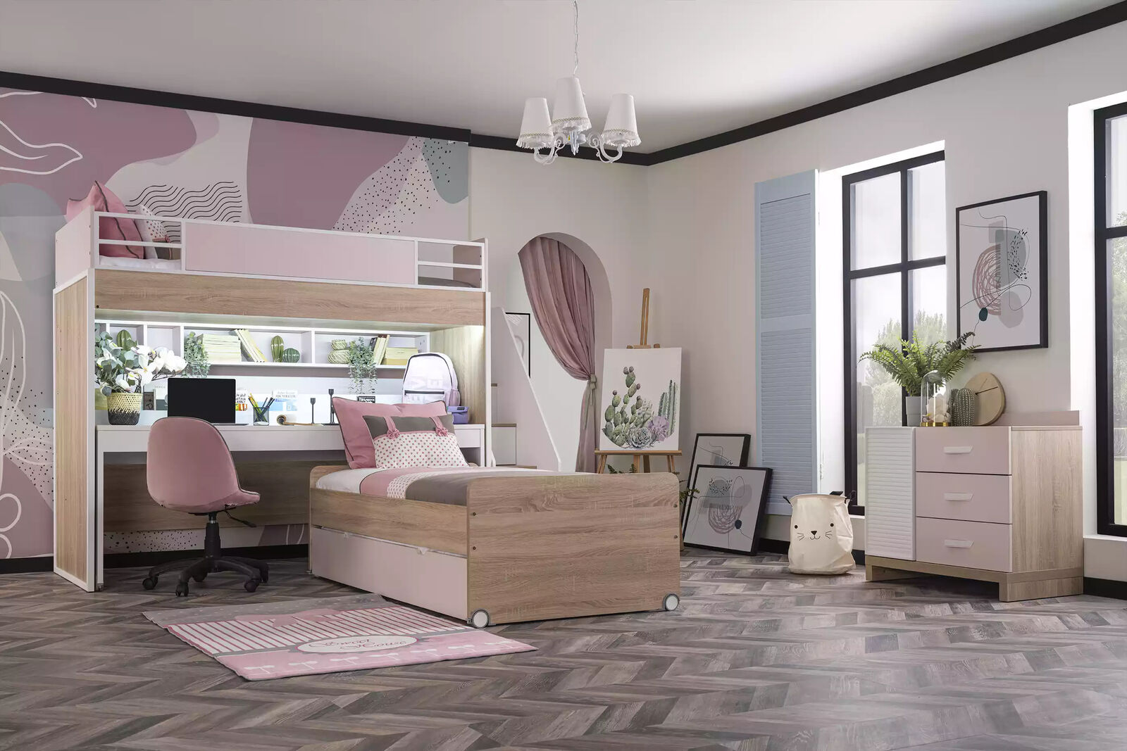 Etagenbett Bett mit 3 Schlafplätzen Multifunktionsbett Holz Rosa Luxus Hochbett