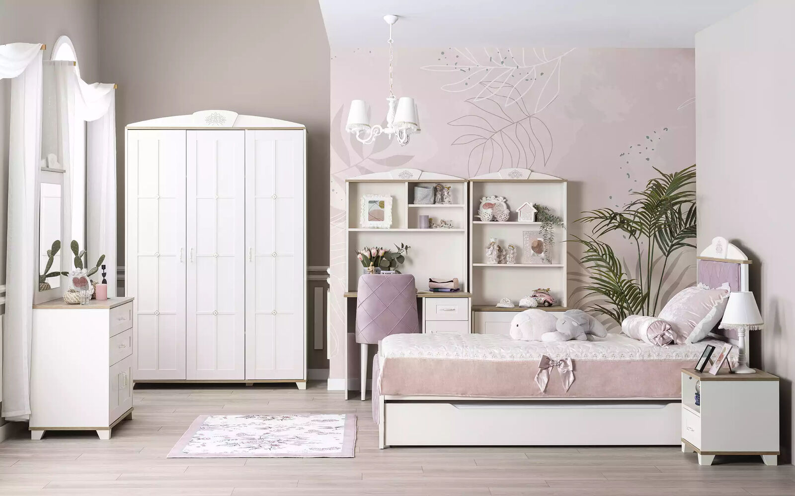 Komplete Jugendbett Kindermöbel Kinderzimmer Bett Holz Rosa Set 8tlg