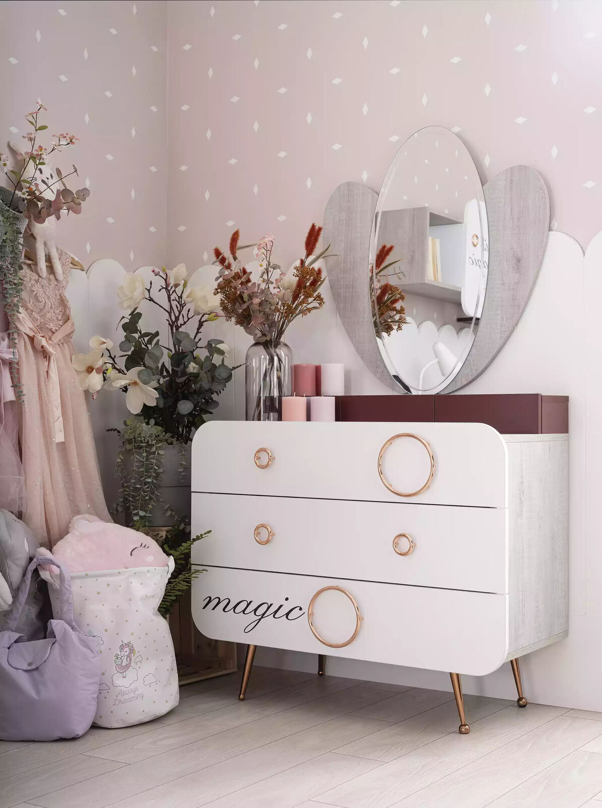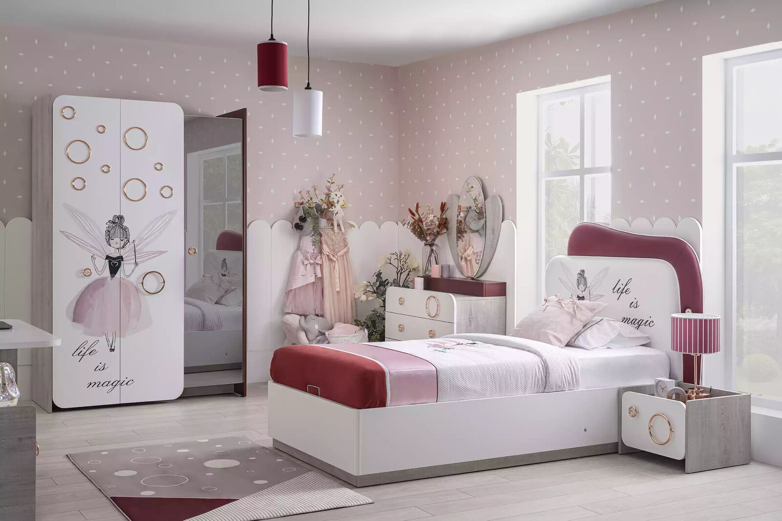 Entdecken Sie unser komplettes Kindermöbel-Set in Rosa aus Holz! Das Set beinhaltet ein Kinderbett mit Bettkasten, Nachttisch, Kleiderschrank, Kommode, Spiegel und Schreibtisch. Hergestellt aus hochwertigem Holz, bietet das Bett eine Matratzenaufliegefläche von ca. 100 cm x 200 cm und hat Maße von ca. 135 cm x 214 cm x 130 cm. Der Kleiderschrank misst ca. 137 cm x 60 cm x 208 cm und die Kommode ca. 96 cm x 47 cm x 86 cm. Mit diesem liebevoll gestalteten Set wird das Kinderzimmer zu einem gemütlichen und schönen Ort. Jetzt bestellen und Ihren Kleinen eine Freude machen!