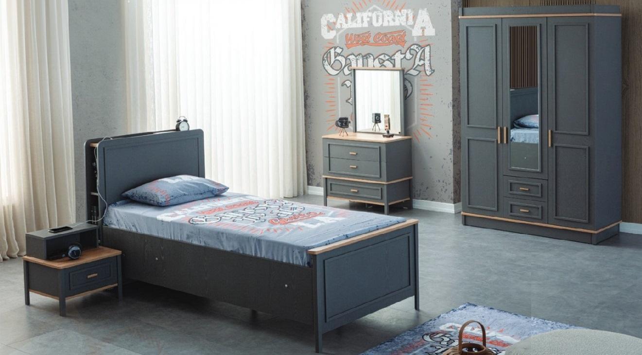 Entdecken Sie diese stilvolle Kindermöbel Garnitur in Grau für das Kinderzimmer. Das Set besteht aus einem Kinderbett, einem Nachttisch, einem Kleiderschrank, einer Kommode und einem Spiegel - alles aus hochwertigem Holz gefertigt. Das Kinderbett hat eine Matratzenaufliegefläche von ca. 100 cm x 200 cm und Maße von ca. 106 cm x 224 cm x 110 cm. Der Nachttisch, Kleiderschrank, Kommode und Spiegel vervollständigen das Set perfekt. Holen Sie sich dieses Set jetzt für ein modernes und gemütliches Kinderzimmer!