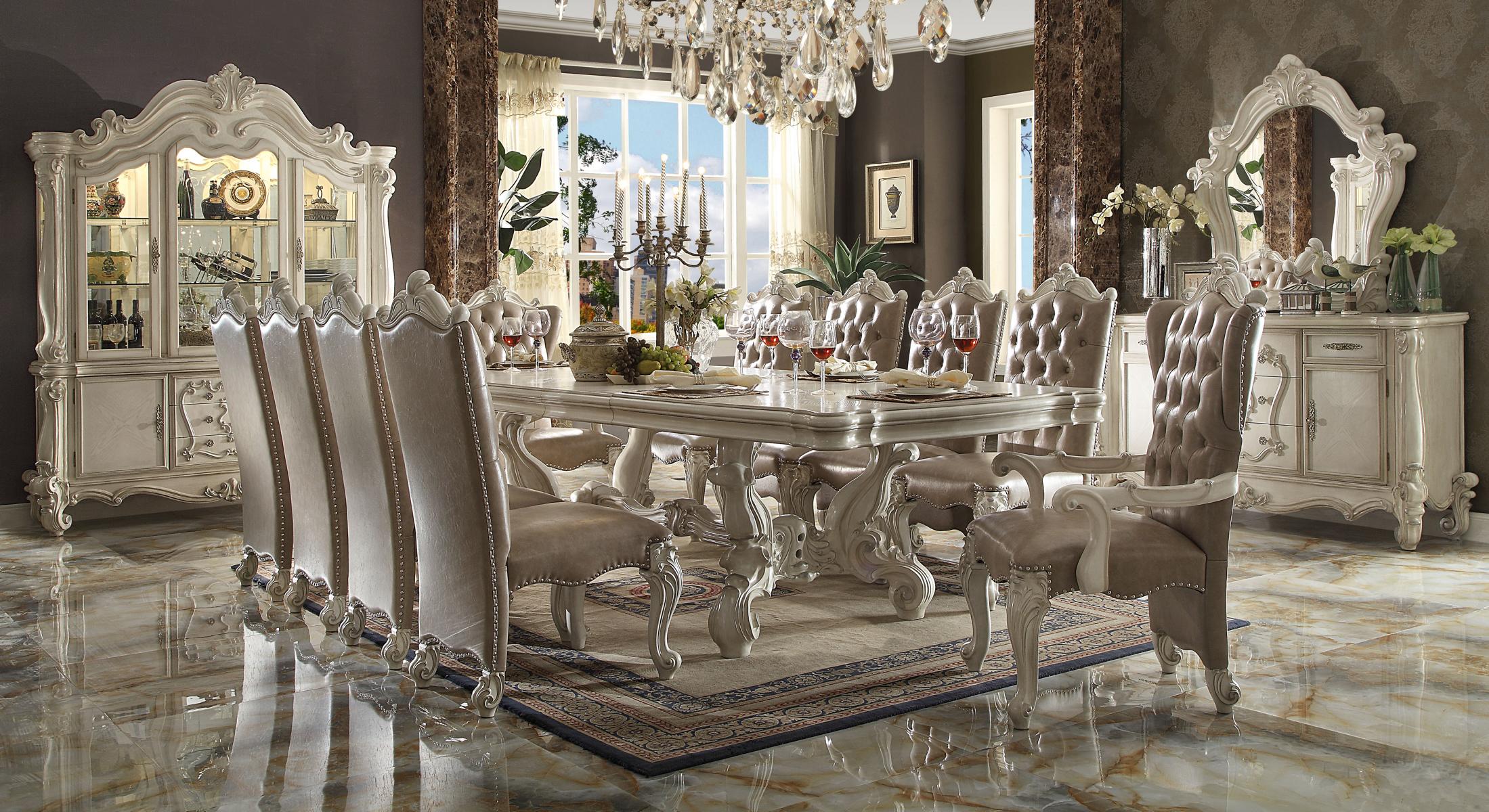 Klassische Esszimmergarnitur in Altweiß Großer Esstisch mit Chesterfield Stühlen