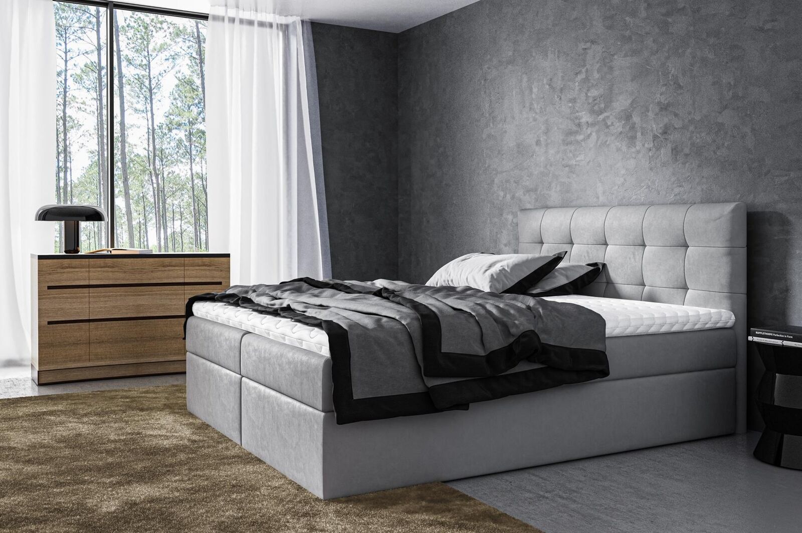 Erhalten Sie ultimativen Komfort mit unserem modernen Boxspringbett für Ihr Schlafzimmer! Mit aufwendiger Handwerkskunst gefertigt, bietet dieses Doppelbett mit einer Liegefläche von ca. 180 x 200 cm die perfekte Mischung aus Stil und Funktionalität. Ausgestattet mit 2 geräumigen Bettkästen und einer Matratze aus Bonellfedern sowie einem Topper aus hochflexiblem Schaumstoff, erleben Sie erholsame Nächte in diesem Ehebett. Die automatische Federöffnung der Bettkästen macht die Nutzung noch komfortabler. Wählen Sie aus einer Vielzahl von Farben und Materialien, wie Samt, Velours, Polyester, Kunstleder oder Leder, um das Bett ganz nach Ihrem Geschmack zu gestalten. Optional stehen auch andere Maße zur Verfügung, sodass Sie die perfekte Größe für Ihr Schlafzimmer auswählen können. Inklusive Bett - lassen Sie sich von Luxus und Gemütlichkeit umhüllen!