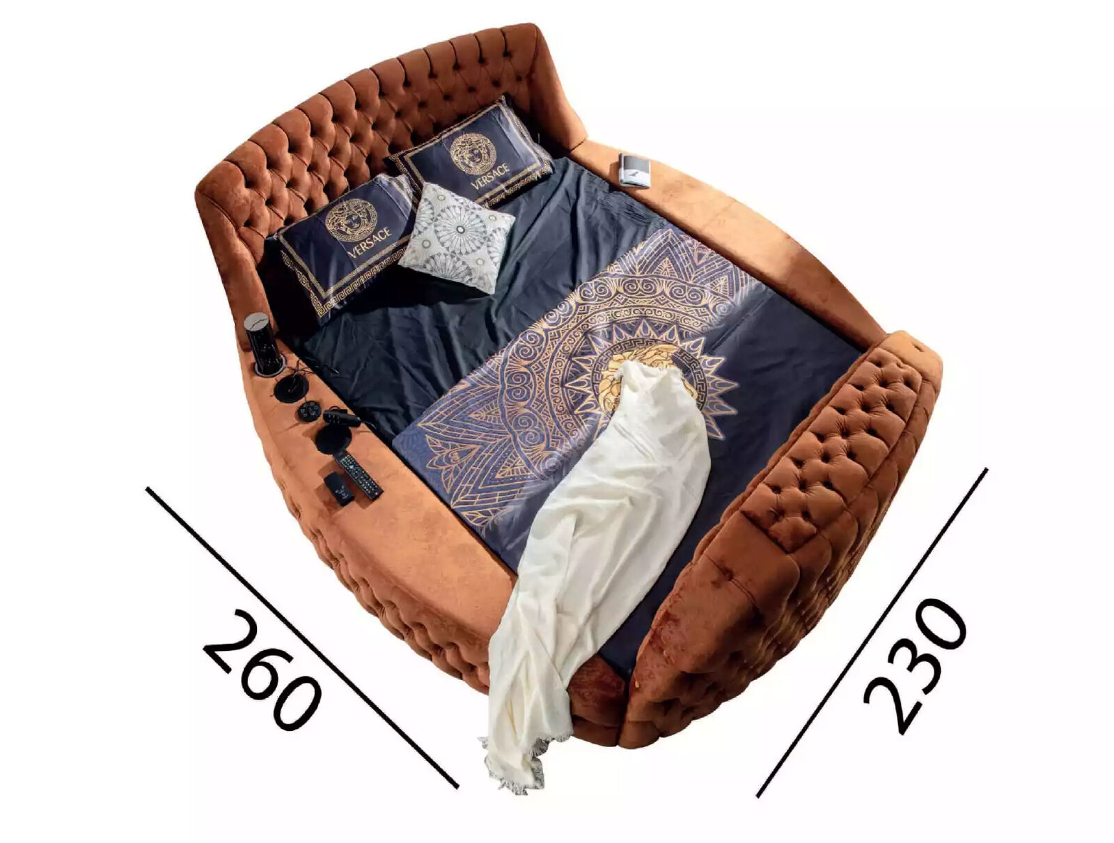 Hol dir das luxuriöse Chesterfield Bett Polster Design in Braun mit integriertem TV Fernseher für dein Zuhause! Dieses elegante Bett von XL Moebel ist nicht nur ein Blickfang, sondern bietet auch höchsten Schlafkomfort. Gefertigt aus Holz und Samt in den Maßen ca. 230 x 260 x 90 cm (Länge x Breite x Höhe) mit einer Liegefläche von 200 x 200 cm, ist dieses Bett perfekt für gemütliche Nächte. Hol dir jetzt dieses exklusive Bettset, das deinem Schlafzimmer einen Hauch von Luxus verleiht.