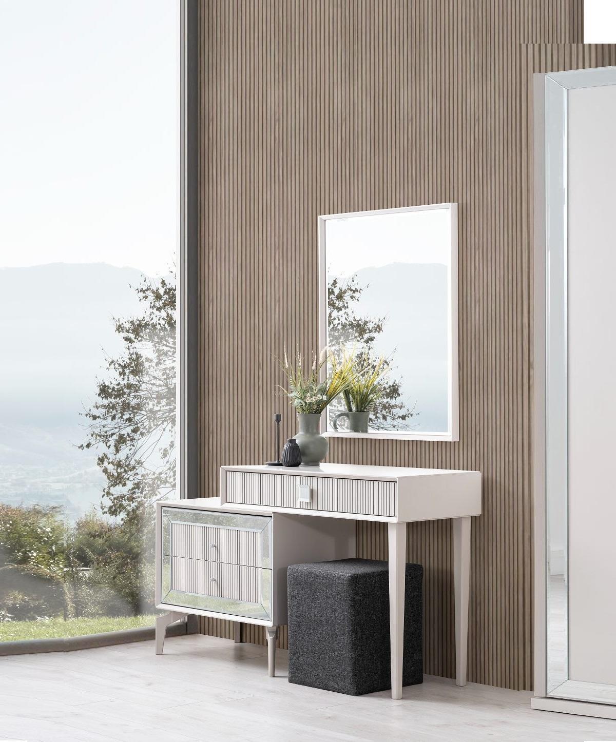 Erhellen Sie Ihr Schlafzimmer mit unserer Großen Schlafzimmer Garnitur Doppelbett Bett Holz Set in modernem Weiß! Das 7-teilige Set umfasst ein gemütliches Bett mit den Maßen 160 cm x 200 cm, Nachttische, einen geräumigen Kleiderschrank, eine elegante Kommode, einen schicken Spiegel und einen bequemen Hocker. Alle Möbelstücke sind aus hochwertigem Holz und Stoff gefertigt. Holen Sie sich jetzt dieses stilvolle Set von XL Moebel und genießen Sie traumhafte Nächte in einem modernen Ambiente.