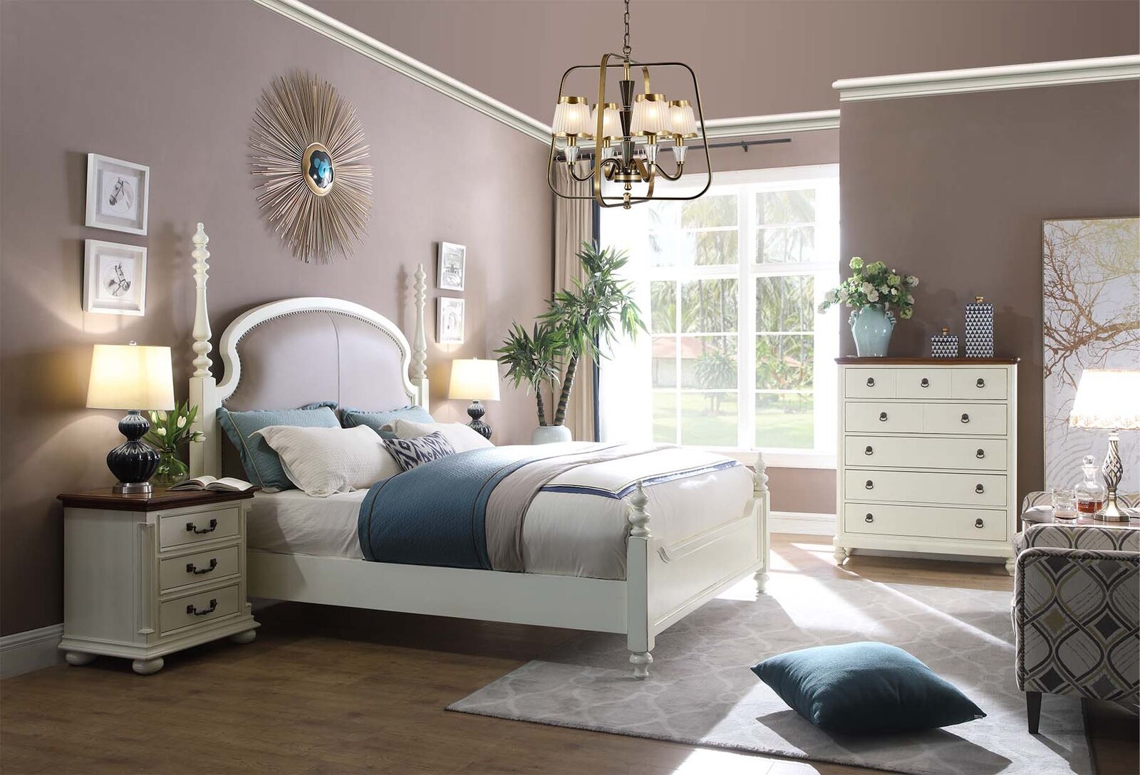 Schlafzimmermöbel, Weißtöne, stilvoller Bezug