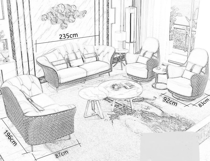 Verschönern Sie Ihr Wohnzimmer mit unserem Designer Garnituren Sofa Couch Polster Garnitur 6tlg. Set aus Leder inklusive Couchtischen. Die Komplette Sets sind in verschiedenen Farben erhältlich, darunter Ocker, Safrangelb, Azurblau und vielen mehr. Wählen Sie einfach Ihre Lieblingsfarbe! Hergestellt aus hochwertigem Premium Lederfaserstoff (70% Leder / 30% Polyester) bieten wir Ihnen auch verschiedene Materialoptionen zur Auswahl. Entscheiden Sie sich für Premium Echtleder, Premium Textilstoff oder Premium Vollleder - je nach Ihren Vorlieben. Dieses luxuriöse Set besteht aus einem 3-Sitzer, einem 2-Sitzer, zwei Sesseln und zwei Couchtischen. Mit Maßen von ca. 235 x 87 x 97 cm für das 3-Sitzer Sofa, ca. 196 x 87 x 97 cm für das 2-Sitzer Sofa und ca. 92 x 83 x 110 cm für die Sessel, wird dieses Set Ihrem Wohnzimmer Eleganz verleihen. Haben Sie Fragen zur Farbe oder Größe? Kontaktieren Sie uns gerne - wir sind für Sie da! Gönnen Sie sich dieses exklusive Designer-Set für ein stilvolles Wohnzimmer!