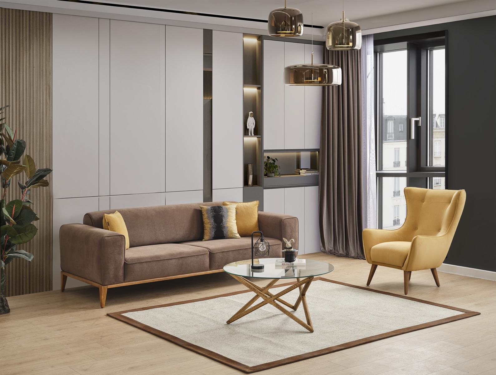 Sofagarnitur Sofa 4 Sitzer Sessel Gelb Stoff Btaun Modern Viersitzer