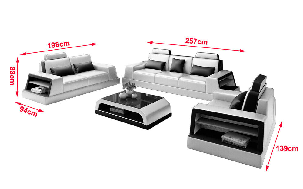 Entdecken Sie die Moderne Sofagarnitur 321 Sitzer Sofa Couch Polster Garnitur Couchen Leder für Ihr Wohnzimmer! Dieses stilvolle Set ist in verschiedenen Farben erhältlich, darunter Ocker, Safrangelb, Marineblau, Gold und viele mehr. Die Maße des Sofas sind ca. 257 x 88 x 94 cm für den 3-Sitzer, ca. 198 x 88 x 94 cm für den 2-Sitzer und ca. 139 x 88 x 94 cm für den Sessel. Hergestellt aus hochwertigem Premium Lederfaserstoff (70% Leder / 30% Polyester) bietet dieses Möbelstück Komfort und Eleganz in einem. Sie haben auch die Möglichkeit, zwischen verschiedenen Materialien zu wählen, darunter Premium Echtleder, Premium Textilstoff und mehr. Das Innengestell aus echtem Holz sorgt für Stabilität und Langlebigkeit. Kreieren Sie mit dieser Sofagarnitur eine harmonische Atmosphäre in Ihrem Zuhause!