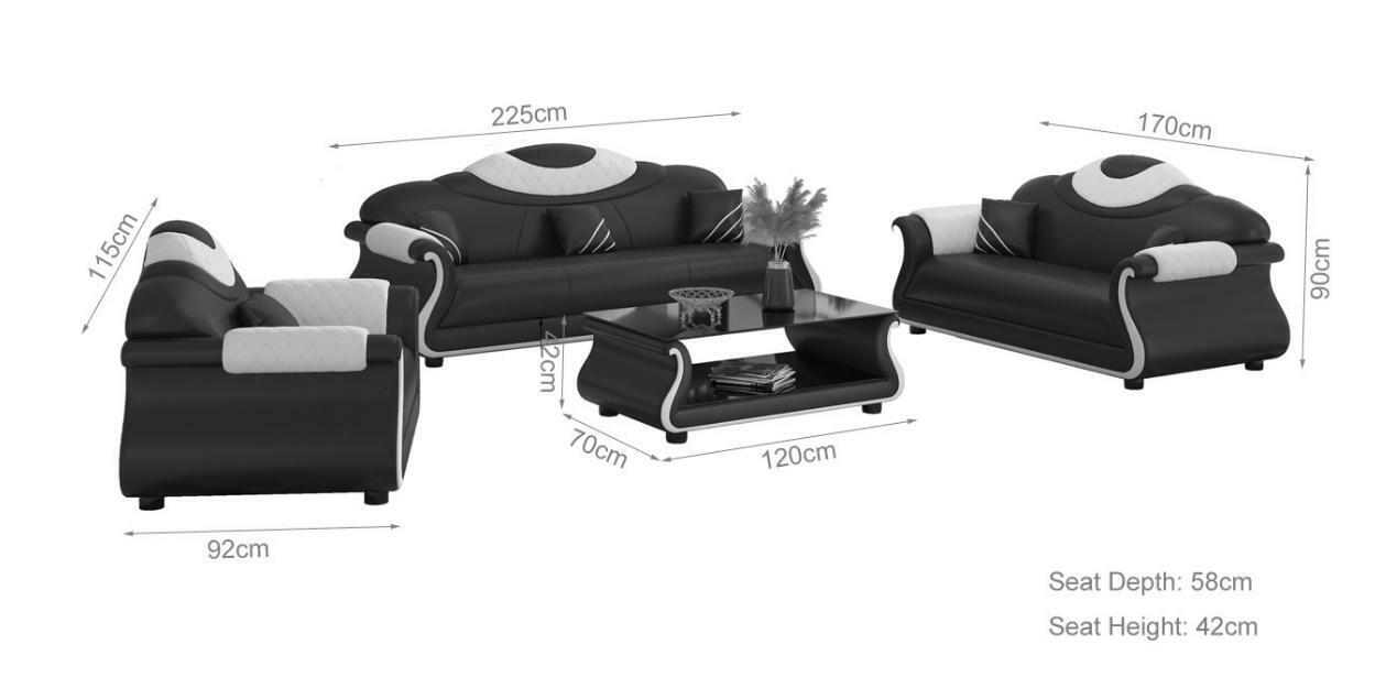 Entdecken Sie unsere hochwertige Sofagarnitur 3+2+1 Sitzer Wohnlandschaft! Mit unseren verschiedenen Farboptionen können Sie diese stilvolle Polstercouch perfekt an Ihre Einrichtung anpassen. Wählen Sie aus Farben wie Ocker, Kobaltblau, Schokolade, Gold und vielen mehr! Die Maße der Sofagarnitur sind wie folgt: - 3-Sitzer: 225 * 92 * 90 cm - 2-Sitzer: 170 * 92 * 90 cm - Sessel: 115 * 92 * 90 cm Die Garnitur ist aus einem hochwertigen Premium Lederfaserstoff (70% Leder / 30% Polyester) gefertigt. Sie haben auch die Möglichkeit, aus verschiedenen Materialien wie Premium Echtleder oder Textilstoff zu wählen. Erleben Sie Komfort und Eleganz mit einer Sofagarnitur, die nicht nur gut aussieht, sondern auch langlebig ist. Verschönern Sie Ihr Wohnzimmer mit dieser exklusiven Wohnlandschaft!