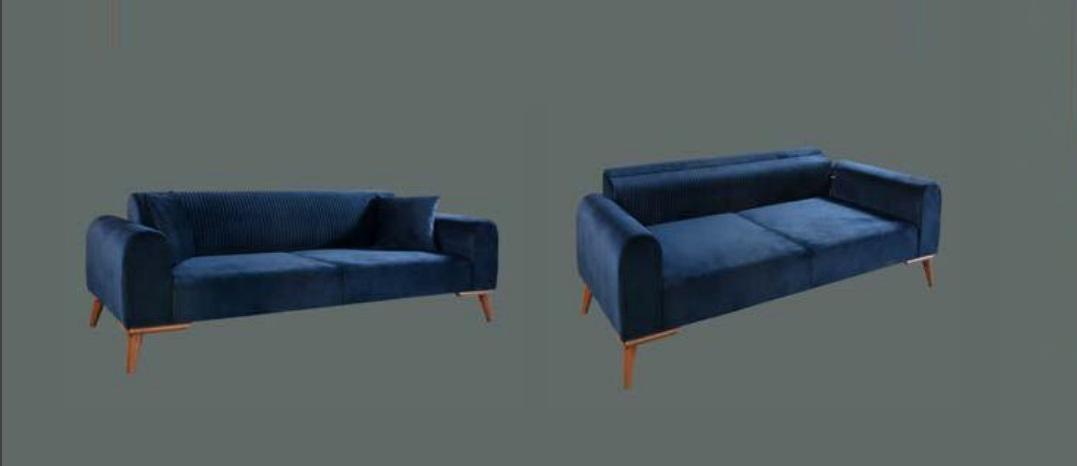 Entspannen Sie in königlichem Stil mit unserer Sofagarnitur 3+3+1 Sitzer Sofa Sessel Royal! Diese bezaubernde blaue Couch aus samtigem Stoff verleiht Ihrem Wohnzimmer Eleganz und Gemütlichkeit zugleich. Die Maße von ca. 222 x 92 x 77 cm für die beiden 3-Sitzer Sofas und ca. 75 x 90 x 82 cm für den Sessel bieten ausreichend Platz zum Entspannen. Der Sitz ist ca. 44 cm hoch und die Sitztiefe beträgt ca. 56 cm. Hergestellt aus hochwertigem Textil und Holz, überzeugt die Garnitur nicht nur mit ihrem Design, sondern auch mit ihrer Qualität. Erhältlich wie abgebildet, können Sie die Sofagarnitur auch in anderen Farben anfragen. Bringen Sie königlichen Flair in Ihr Zuhause!