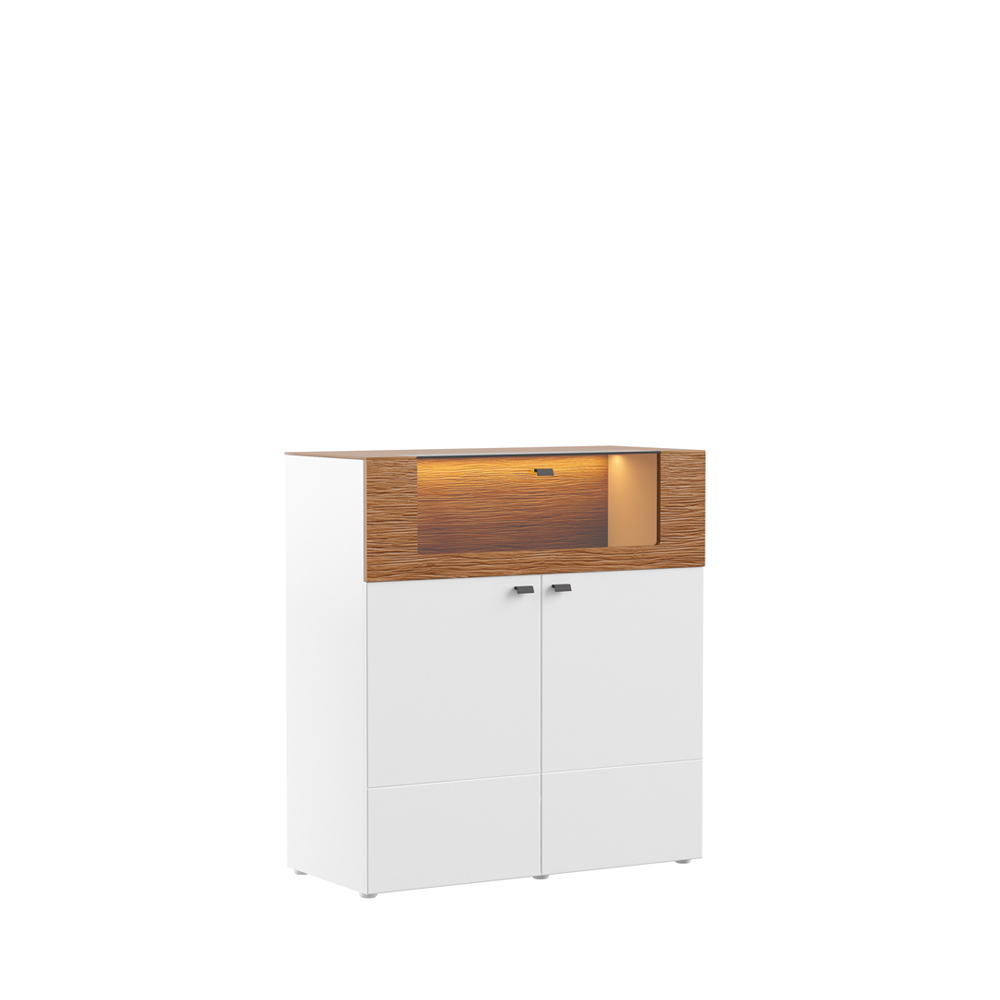 Rückwand & Einlegeböden: MDF (Mitteldichte Holzfaserplatte), furniert & lackiert