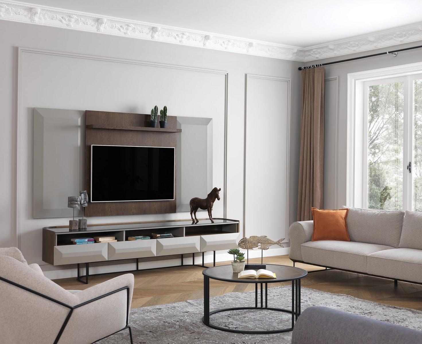 Entdecken Sie das stilvolle 2-teilige Gruppe RTV Lowboard TV Ständer Sideboard Panel in Braun von XL Möbel! Mit einer Länge von ca. 240 cm und einer Höhe von ca. 57 cm bietet dieses Möbelstück genügend Platz für Ihren Fernseher und weitere Geräte. Das dazu passende Regal mit einer Höhe von ca. 120 cm bietet zusätzlichen Stauraum für Dekorationen oder Bücher. Hergestellt aus hochwertigem Holz fügt sich dieses TV-Ständer Sideboard perfekt in Ihr Wohnzimmer ein. Holen Sie sich jetzt dieses elegante Möbelstück nach Hause und lassen Sie sich von der Qualität und dem Design überzeugen!