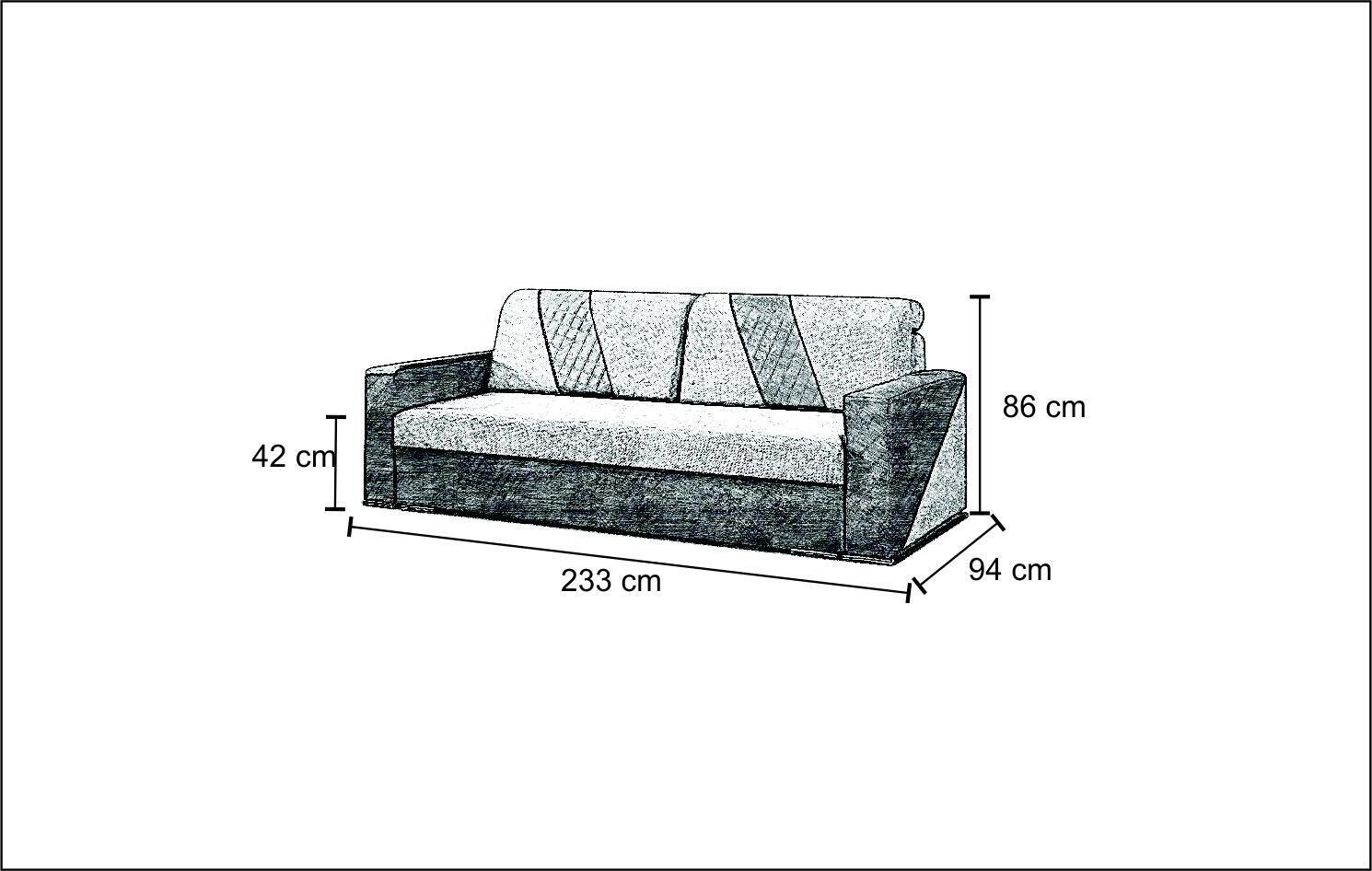 Erwerben Sie jetzt unseren luxuriösen Dreisitzer - das Sofa 3-er Sofas Luxus Schlafsofa Couchen! Dieses hochwertige Polstermöbelstück besticht durch sein modernes Design und bietet nicht nur Komfort, sondern auch Stil in Ihrem Zuhause. Mit den Maßen ca. 233 x 94 x 86 cm und einem Schlafbereich von ca. 147 x 197 cm ist dieses Sofa perfekt für gemütliche Abende oder für Übernachtungsgäste. Das Innengestell aus echtem Holz und Federkern sorgt für Stabilität und Langlebigkeit. Wählen Sie aus einer Vielzahl von Farben wie Taupegrau, Asphaltgrau, Lavendelgrau und vielen mehr! Dieses neue, hochwertige Möbelstück wird Ihren Raum neu definieren und zu einem echten Blickfang machen. Holen Sie sich jetzt Ihren neuen Dreisitzer und entspannen Sie in Luxus und Stil!