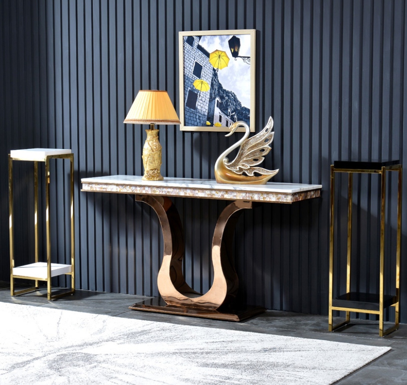 Entdecken Sie den Designer Edelstahl Konsolentisch Tisch von XL Moebel! Der Konsolentisch in den Maßen ca. 120 x 40 x 82 cm (Länge x Breite x Höhe) ist die perfekte Ergänzung für Ihr Zuhause. Hergestellt aus Marmor und Edelstahl, besticht dieser Tisch durch sein elegantes Design und seine hochwertige Verarbeitung. Erhältlich in der abgebildeten Farbe ist er ein stilvoller Blickfang in jedem Raum. Sie suchen eine andere Größe? Kontaktieren Sie uns für weitere Informationen. Bringen Sie mit diesem Konsolentisch Eleganz und Stil in Ihr Zuhause!